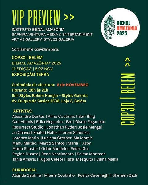 A realização é do Instituto Bienal Amazônia (IBA), com apresentação de Saphira Ventura Media & Entertainment, Art A3 Gallery e Styles Galeria. A curadoria internacional é assinada por Alcinda Saphira (Nova York), Milene Coutinho (Belém), Rosita Cavenaghi (São Paulo) e Shereen Badr (Egito), unindo repertórios globais e perspectivas plurais.